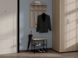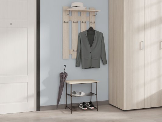 Удобная и гармоничная вешалка для одежды, помимо крючков для одежды имеется полка для головных уборов.